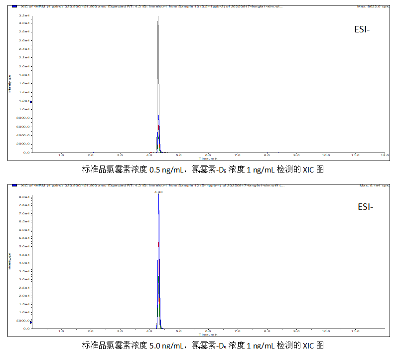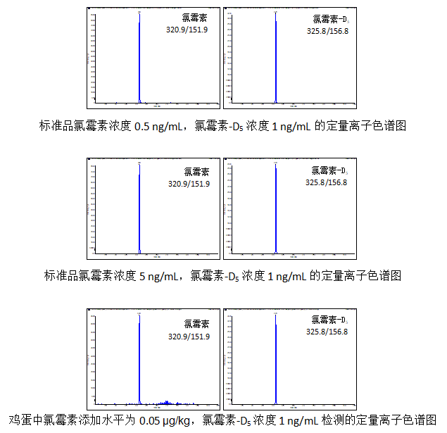 该标准相比以往液相色谱串联质谱检测方法的要求更严格,要求在相同测试条件下,试样溶液中氯霉素与其同位素内标(氯霉素-D5)的保留时间之比与标准溶液中氯霉素与其同位素内标(氯霉素-D5)的保留时间之比偏差在1%以内;且检测到的相对离子丰度应当与浓度相当的校正标准溶液相对离子丰度一致,其允许偏差为±40%。根据中华人民共和国农业农村部公告第250号《食品动物中禁止使用的药品及其他化合物清单》,氯霉素及其盐、酯均被列为禁止使用的药物,在动物性食品中不得检出,相比以往标准GB 31658.2-2021 食品安全国家标准 《动物性食品中氯霉素残留量的测定 液相色谱-串联质谱法》中的检出限要求0.1μg/kg,规定了更低的方法检出限0.05 μg/kg,为食品安全提高了更高的安全边际。