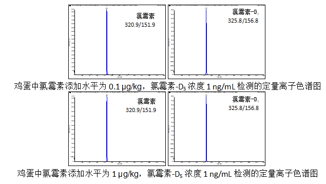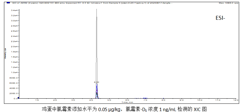 迪马科技参考GB 31659.7-2025食品安全国家标准《禽蛋中氯霉素残留量的测定 液相色谱-串联质谱法》使用UPLC-MS/MS法,乙腈提取,PSA和C18净化提取液,Diamonsil C18(2) 3 μm色谱柱分离,内标法定量,测试了鸡蛋样品,添加回收率在91%-107%,加标样品和标准品的内标和外标保留时间之比的偏差,相对丰度比偏差,都符合标准要求。