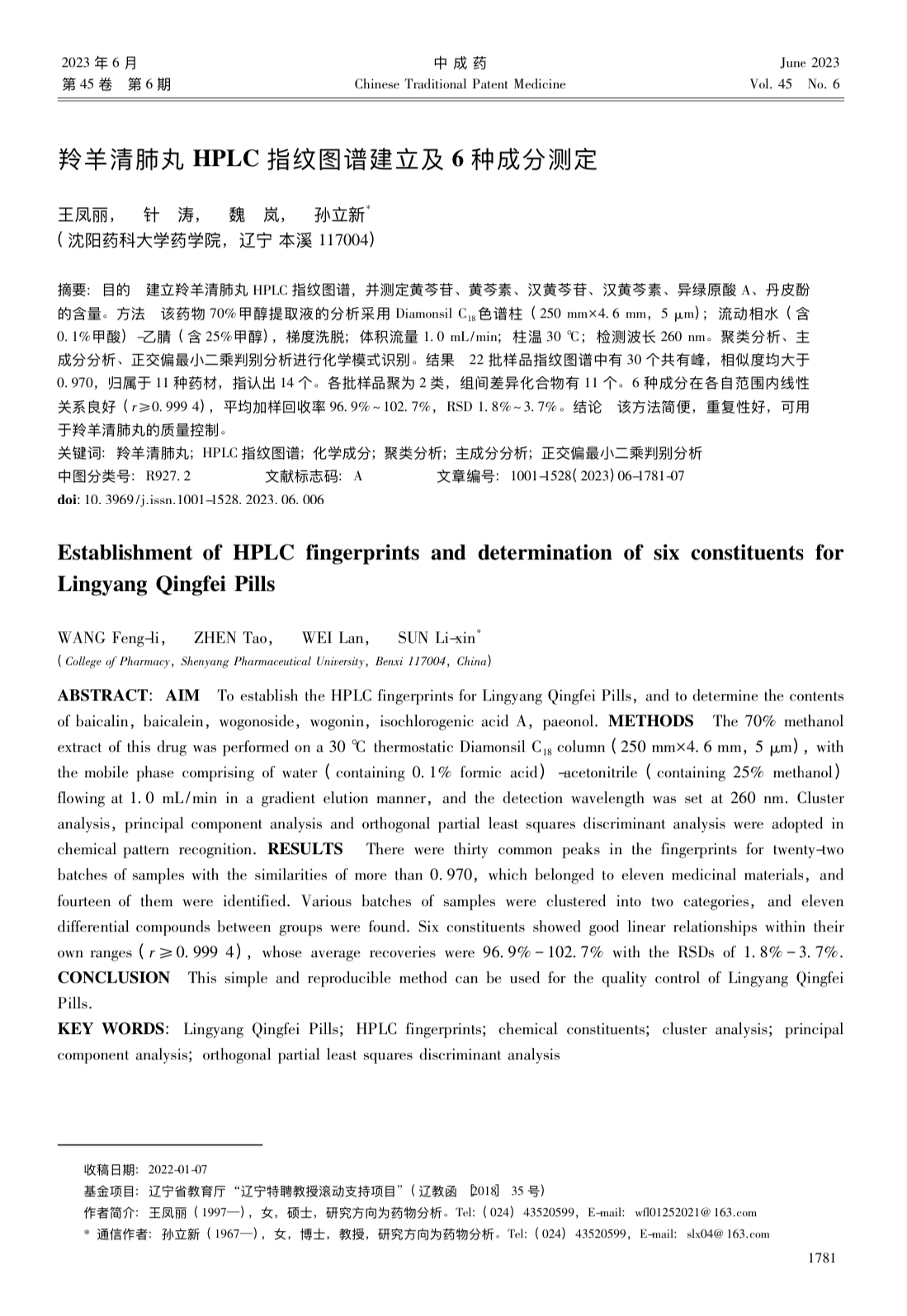 摘要: 目的 建立羚羊清肺丸 HPLC 指纹图谱,并测定黄芩苷、黄芩素、汉黄芩苷、汉黄芩素、异绿原酸 A、丹皮酚的含量。方法 该药物 70%甲醇提取液的分析采用 Diamonsil C18色谱柱 ( 250 mm×4. 6 mm,5 μm) ; 流动相水 ( 含 0. 1%甲酸) -乙腈 ( 含 25%甲醇) ,梯度洗脱; 体积流量 1. 0 mL/min; 柱温 30 ℃ ; 检测波长 260 nm。聚类分析、主 成分分析、正交偏最小二乘判别分析进行化学模式识别。结果 22 批样品指纹图谱中有 30 个共有峰,相似度均大于 0. 970,归属于 11 种药材,指认出 14 个。各批样品聚为 2 类,组间差异化合物有 11 个。6 种成分在各自范围内线性 关系良好 ( r≥0. 999 4) ,平均加样回收率 96. 9% ~ 102. 7%,RSD 1. 8% ~ 3. 7%。结论 该方法简便,重复性好,可用于羚羊清肺丸的质量控制。