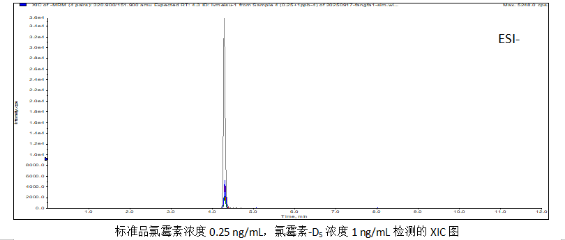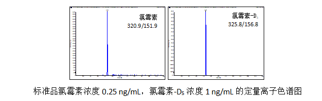 该标准相比以往液相色谱串联质谱检测方法的要求更严格,要求在相同测试条件下,试样溶液中氯霉素与其同位素内标(氯霉素-D5)的保留时间之比与标准溶液中氯霉素与其同位素内标(氯霉素-D5)的保留时间之比偏差在1%以内;且检测到的相对离子丰度应当与浓度相当的校正标准溶液相对离子丰度一致,其允许偏差为±40%。根据中华人民共和国农业农村部公告第250号《食品动物中禁止使用的药品及其他化合物清单》,氯霉素及其盐、酯均被列为禁止使用的药物,在动物性食品中不得检出,相比以往标准GB 31658.2-2021 食品安全国家标准 《动物性食品中氯霉素残留量的测定 液相色谱-串联质谱法》中的检出限要求0.1μg/kg,规定了更低的方法检出限0.05 μg/kg,为食品安全提高了更高的安全边际。