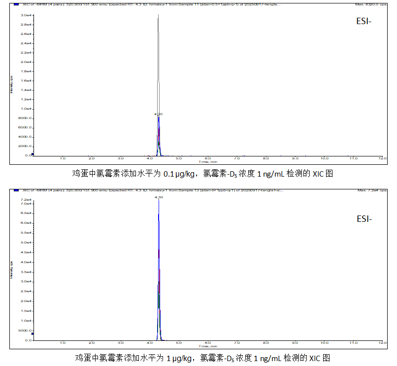 迪马科技参考GB 31659.7-2025食品安全国家标准《禽蛋中氯霉素残留量的测定 液相色谱-串联质谱法》使用UPLC-MS/MS法,乙腈提取,PSA和C18净化提取液,Diamonsil C18(2) 3 μm色谱柱分离,内标法定量,测试了鸡蛋样品,添加回收率在91%-107%,加标样品和标准品的内标和外标保留时间之比的偏差,相对丰度比偏差,都符合标准要求。