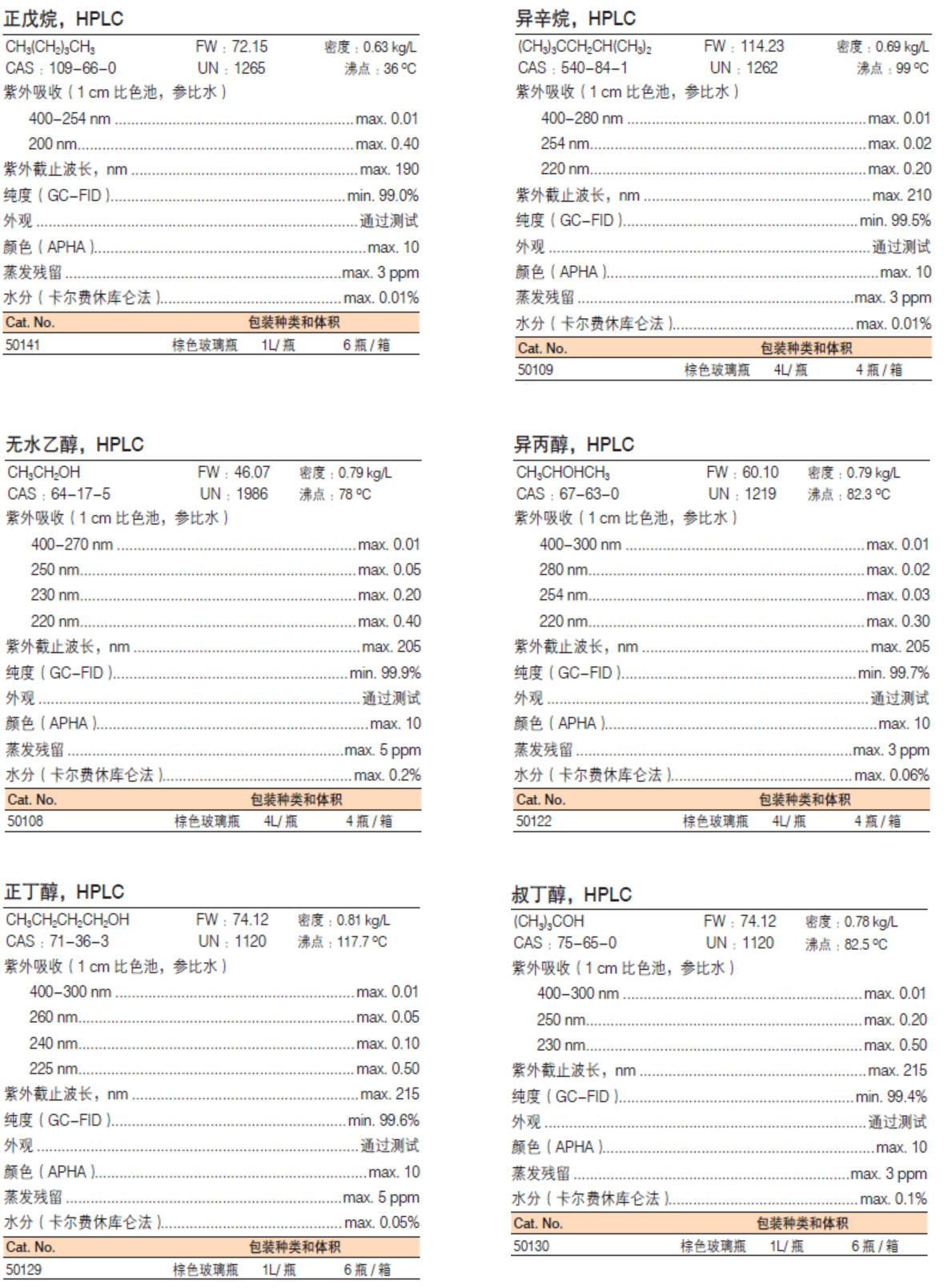 色谱级(HPLC)级溶剂特别保证 -高纯度 -平滑的紫外吸收曲线 -低紫外吸收 -低于或接近理论截止波长 -低蒸发残留 -低含水量 |