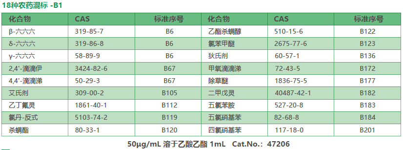 【6】18种农药混标 -B1,50μg/mL 溶于乙酸乙酯 1mL Cat.No.:47206