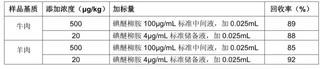 牛肉和羊肉等中碘醚柳胺的添加回收结果: