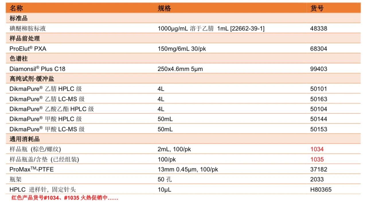 碘醚柳胺1000μg/mL标准储备液:取自Dikma碘醚柳胺1000μg/mL(Cat.#:48338),溶剂乙腈。