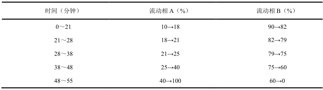 色谱条件与系统适用性试验 以十八烷基硅烷键合硅胶为填充剂(柱长为250mm,内径为4.6mm,粒径为5μm); 以乙腈为流动相A,0.2%磷酸溶液为流动相B,按下表中的规定进行梯度洗脱,流速为每分钟0.8mL;柱温为30℃;检测波长为289nm。理论板数按紫堇灵峰计算应不低于10000。