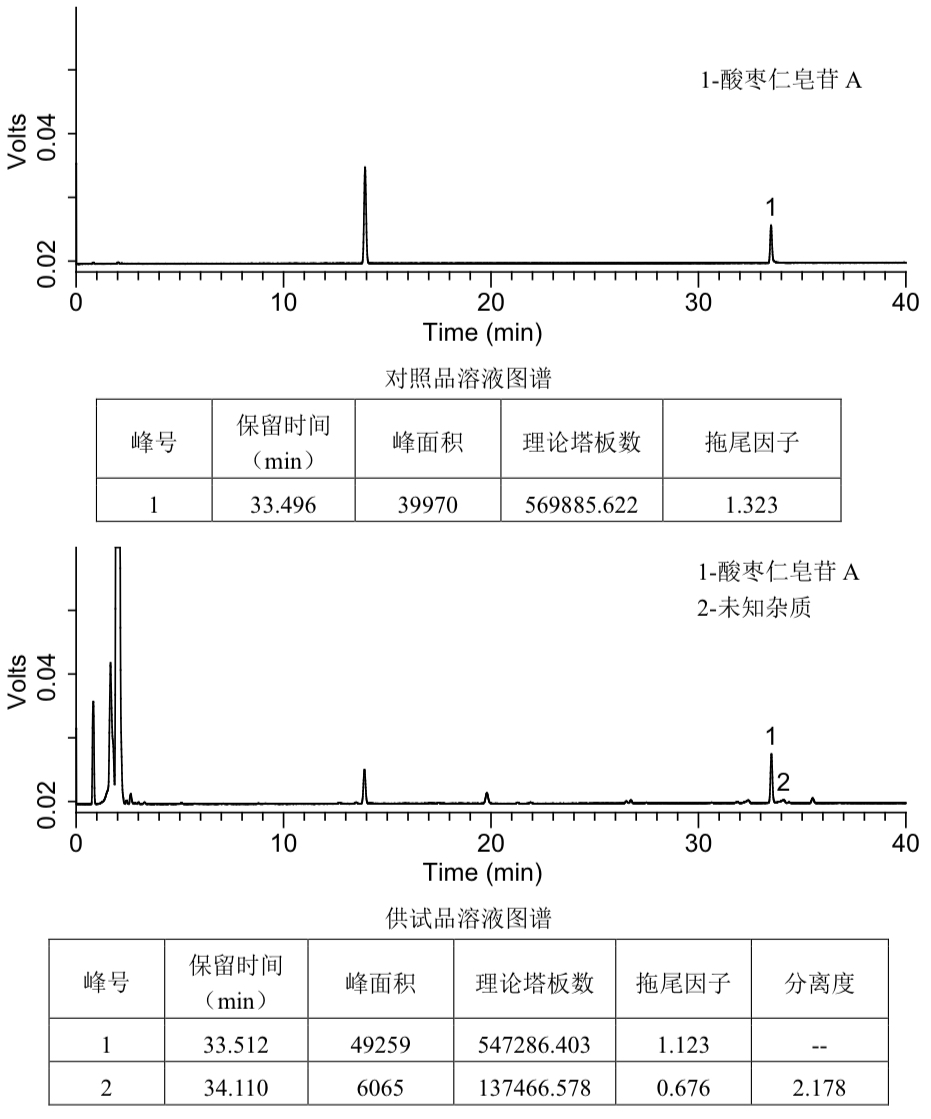 进样量:斯皮诺素:10μL,酸枣仁皂苷A:供试品溶液10μL、对照品溶液15μL