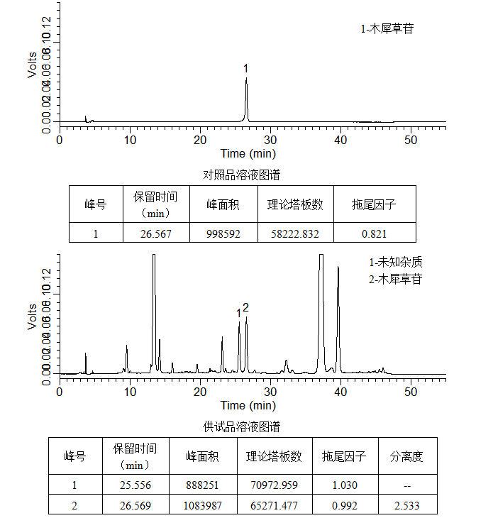 参照2025版《中国药典》金银花中木犀草苷的含量测定方法,使用Platisil PH色谱柱(4.6 mm × 250 mm, 5 μm; Cat#99511)分析供试品溶液,目标峰与相邻杂质峰基线分离,可以满足分析要求。