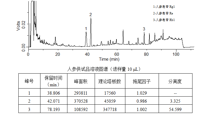 参照2025版《中国药典》人参项下含量测定方法,使用Diamonsil Plus C18色谱柱(4.6 mm × 250 mm, 5 μm; Cat#99403)分析供试品溶液,人参皂苷Rg1、人参皂苷Re、人参皂苷Rb1与其相邻杂质峰可以基线分离,峰形对称,满足系统适用性要求。