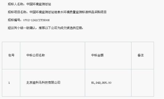 迪马科技凭借优良的产品特性和品质,极高的性价比以及完善的服务,在众多竞争对手中脱颖而出,成功中标中国环境监测总站地表水环境质量监测标准样品采购项目,中标金额为194.9995万元。