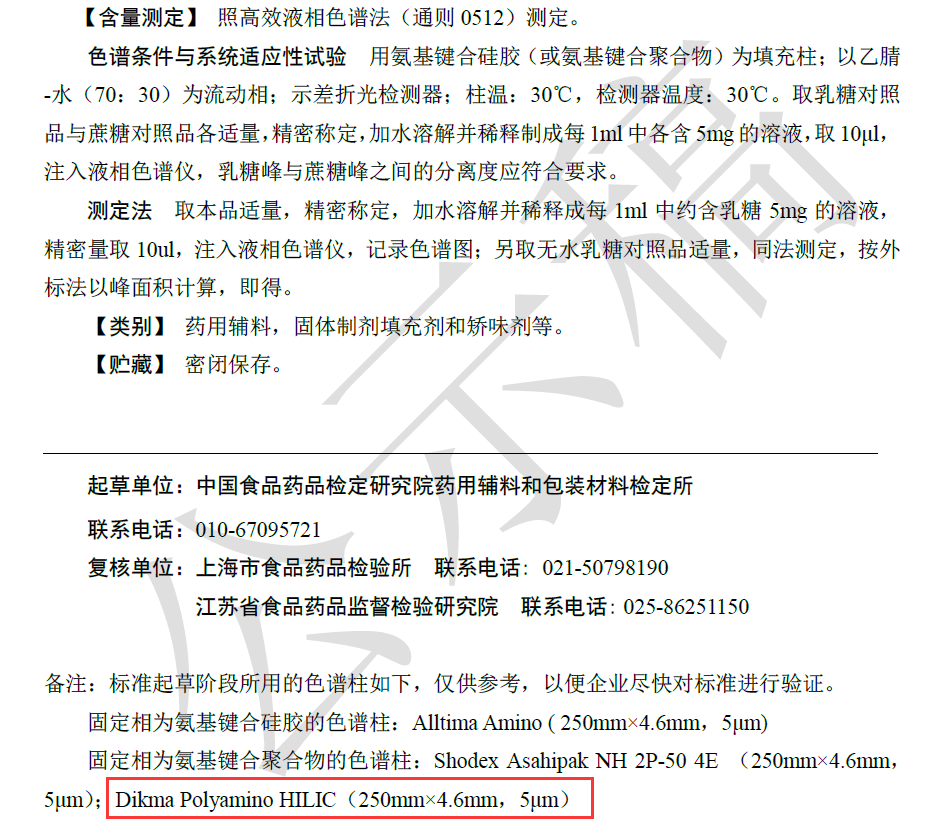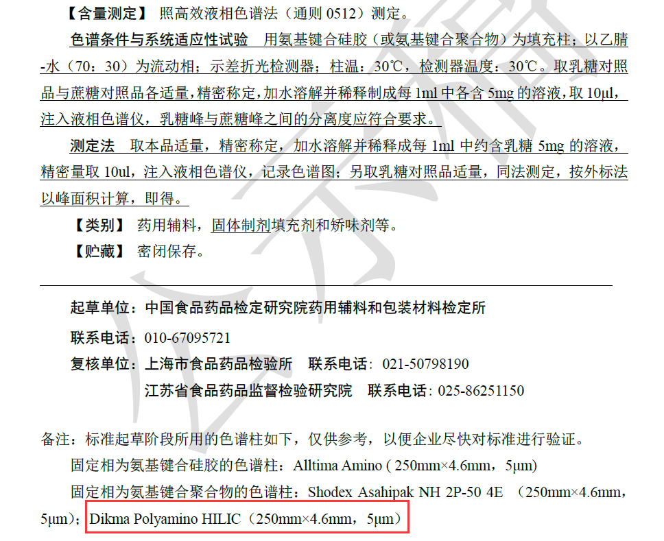 ● 乳糖 2020《中国药典》第四部第691页 ● 色谱柱货号及规格: Cat#: 99301 Dikma Polyamino HILIC 250x4.6mm,5μm ● 检测项目: 含量测定:色谱条件及系统适用性试验 |