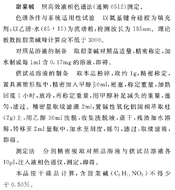 2020 版《中国药典》一部 枸杞子【含量测定】项下甜菜碱的测定,将之前的薄层色谱法改为高效液相色谱法,前处理采用碱性氧化铝固相萃取柱净化。