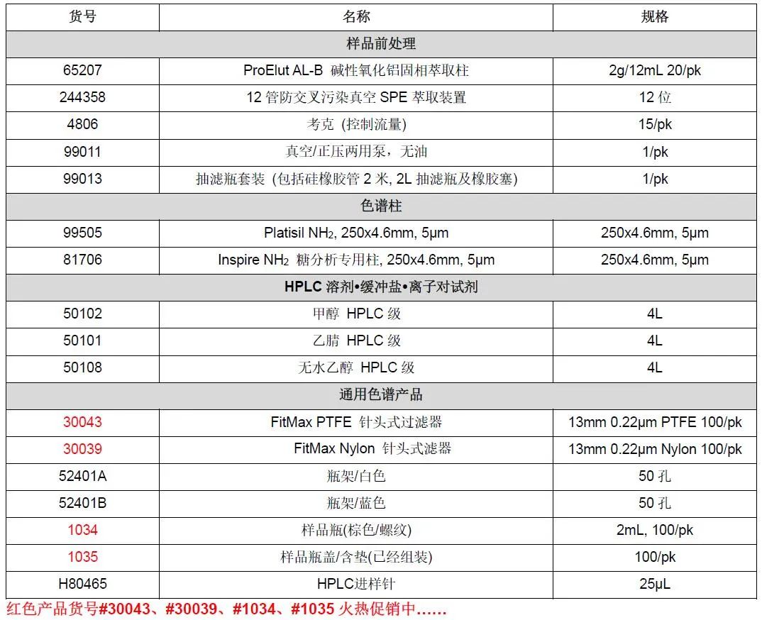 迪马科技根据2020版《中国药典》要求,分别使用Platisil NH2色谱柱、Inspire NH2糖分析专用柱,结合ProElut AL-B 2g/12mL固相萃取柱,取得了良好的分析结果。