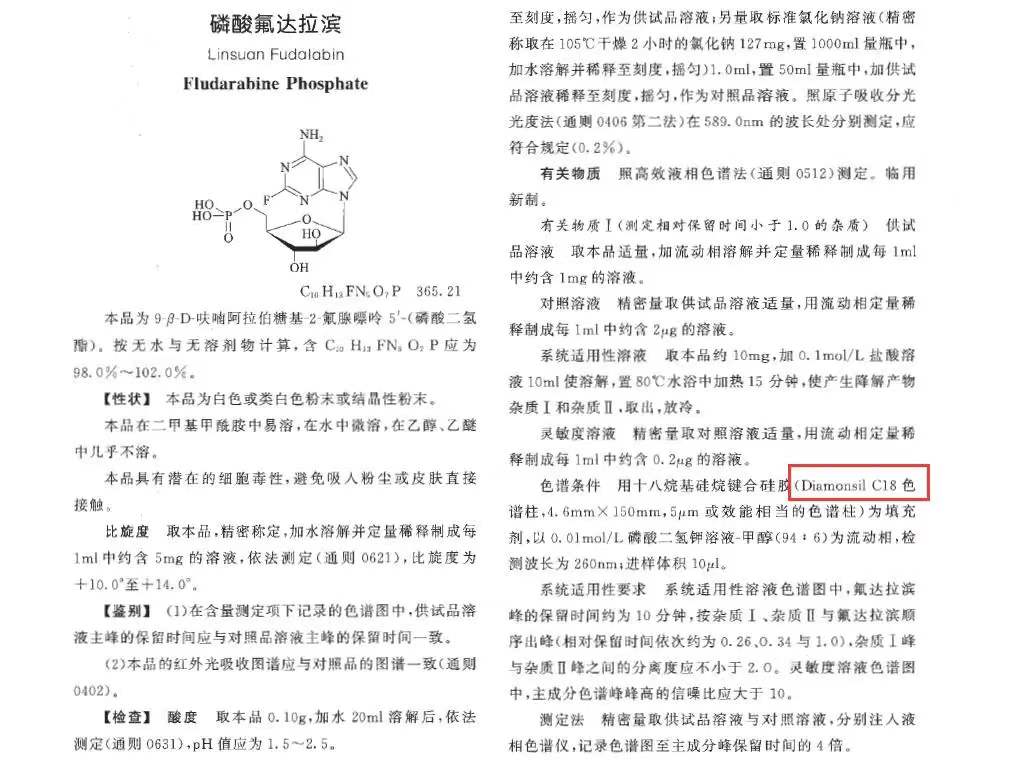2020年7月2日,国家药品监督管理局、国家卫生健康委发布公告,正式颁布2020年版《中华人民共和国药典》(以下简称《中国药典》)。2020年版《中国药典》中,共有16个药物品种推荐使用迪马色谱柱,其中磷酸氟达拉滨、注射用磷酸氟达拉滨的检测详见下方。