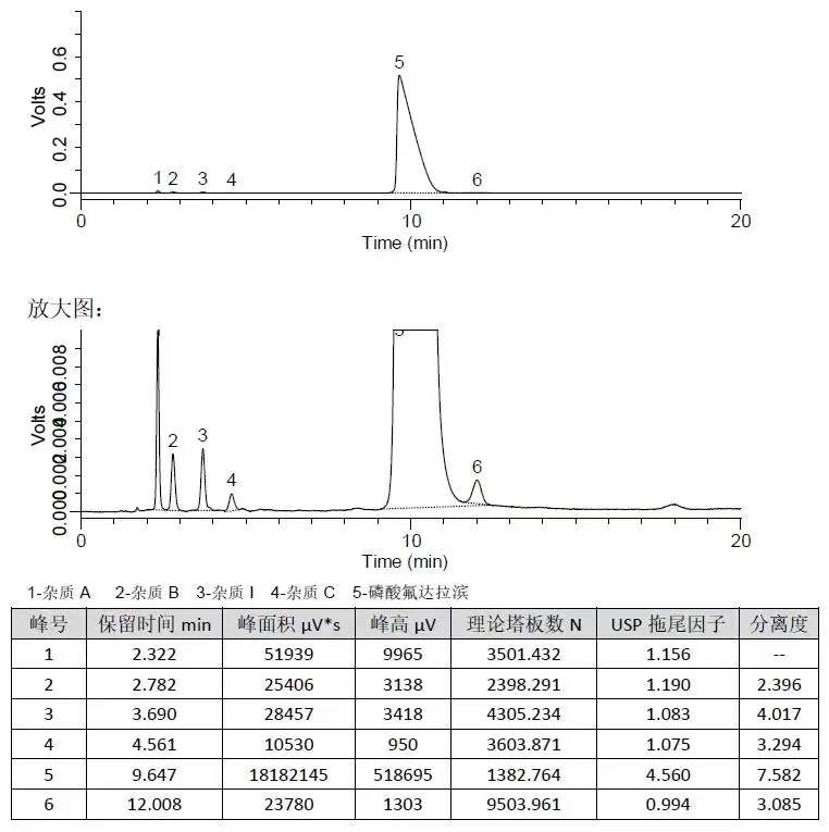 ● 注射用磷酸氟达拉滨 2020《中国药典》第二部第1866页 ● 色谱柱货号及规格: Cat#: 99901 Diamonsil C18 150x4.6mm,5μm |