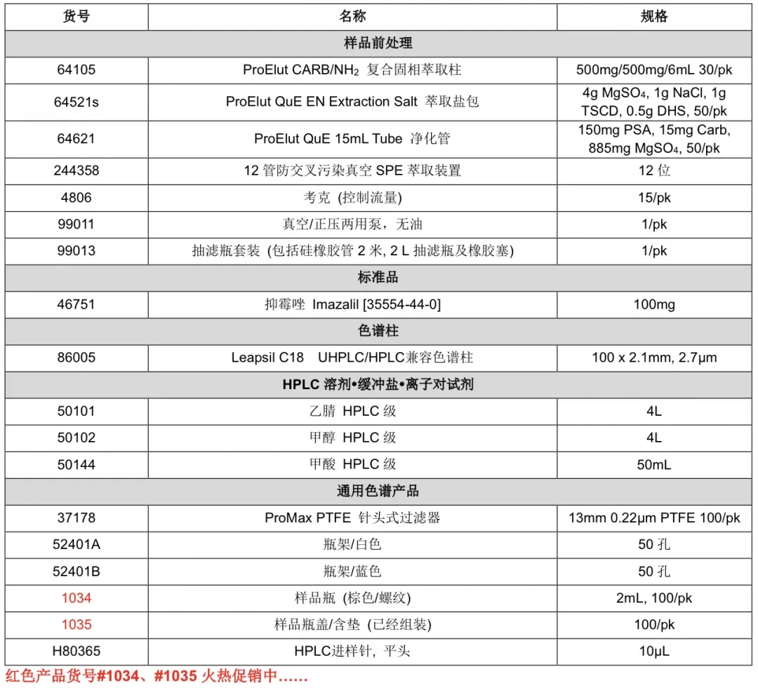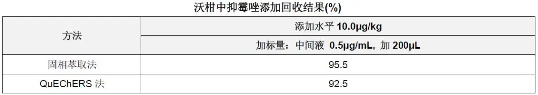 迪马科技参考国家标准《GB 23200.113-2018 食品安全国家标准 植物源性食品中208种农药及其代谢物残留量的测定 气相色谱-质谱联用法》和《GB/T 20769-2008 水果和蔬菜中450种农药及相关化学品残留量的测定 液相色谱-串联质谱法》,建立了沃柑中抑霉唑的检测方法,采用标准中的ProElut Carb/NH2固相萃取柱和QuEChERS净化管净化,Leapsil色谱柱结合UPLC-MS/MS色谱分析,方法定量限为10.0μg/kg,可供广大分析工作者参考。