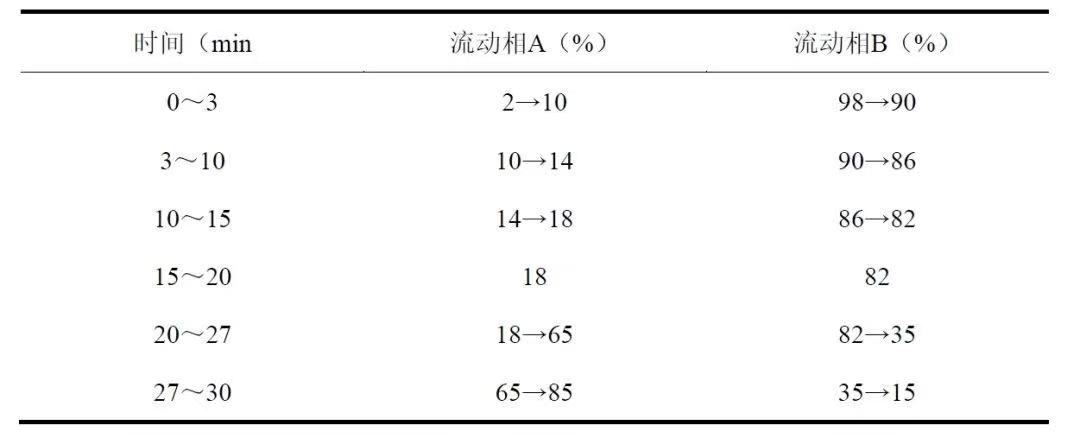 色谱条件与系统适用性试验 以十八烷基硅烷键合硅胶为填充剂(柱长为150mm,内径为2.1mm,粒径为1.8µm);以乙腈为流动相A,以0.05%磷酸溶液为流动相B,按下表中的规定进行梯度洗脱;流速为每分钟0.3mL;柱温为30℃;检测波长为330nm。理论板数按绿原酸峰计算应不低于5000。