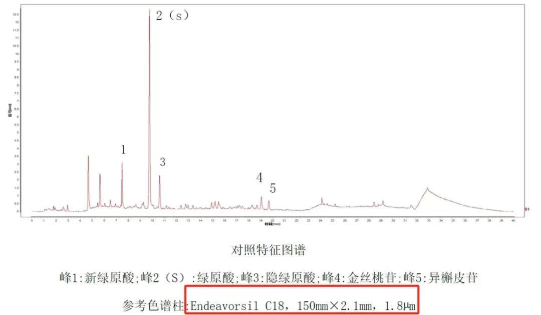 供试品色谱中应呈现5个特征峰,并应与对照药材参照物色谱峰中的5个特征峰保留时间相对应,其中峰2、峰4、峰5应分别与绿原酸、金丝桃苷、异槲皮苷对照品参照物色谱峰保留时间相对应。以绿原酸参照物峰相应的峰为S峰,计算特征峰1、3与S峰的相对保留时间,其相对保留时间应在规定值的±10%范围之内。规定值为:0.76(峰1)、1.07(峰3)。