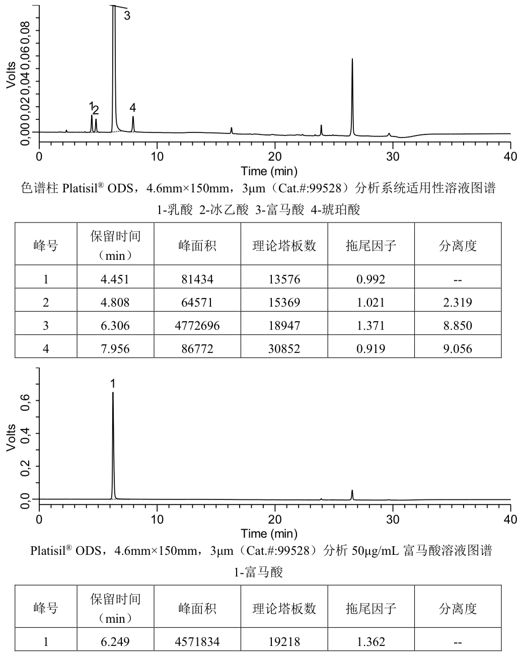 使用色谱柱Platisil® ODS,4.6mm×150mm,3μm(Cat.#:99528)可以实现富马酸、乳酸、冰乙酸、琥珀酸之间的基线分离,其中冰乙酸与乳酸的分离度约为2.3,琥珀酸与富马酸的分离度约为9.1,富马酸峰拖尾因子大约1.4,均符合USP中富马酸鉴别项下系统适用性的要求。
