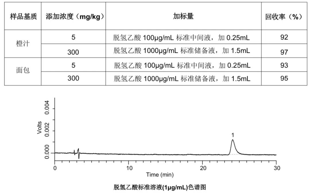 橙汁和面包中脱氢乙酸的添加回收结果。
