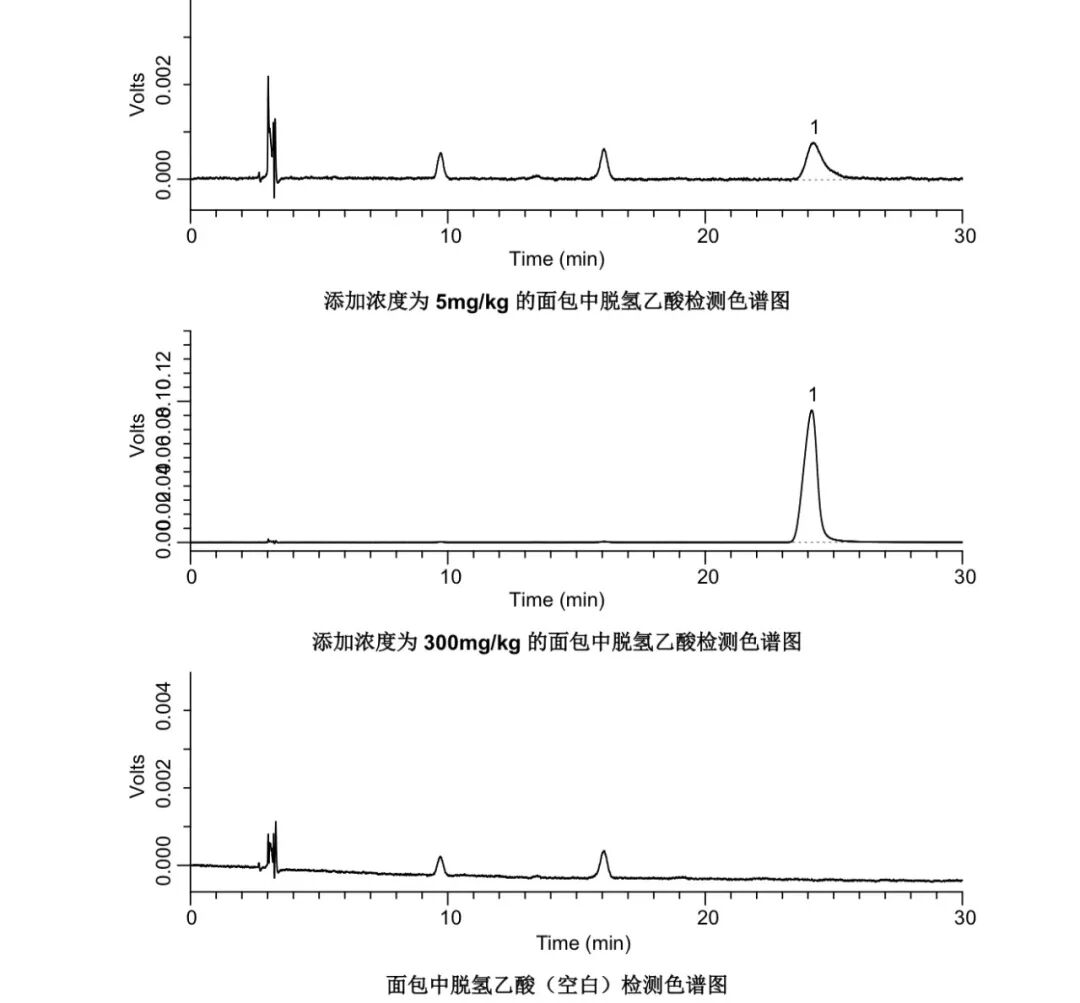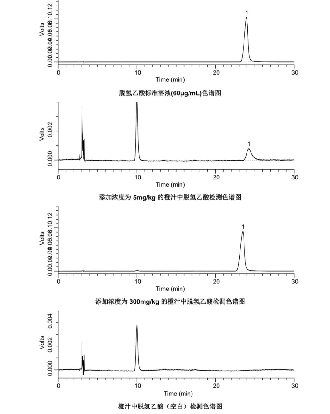 本方案适用于橙汁和面包等样品中脱氢乙酸的测定,定量限5mg/kg,最大使用量300mg/kg。