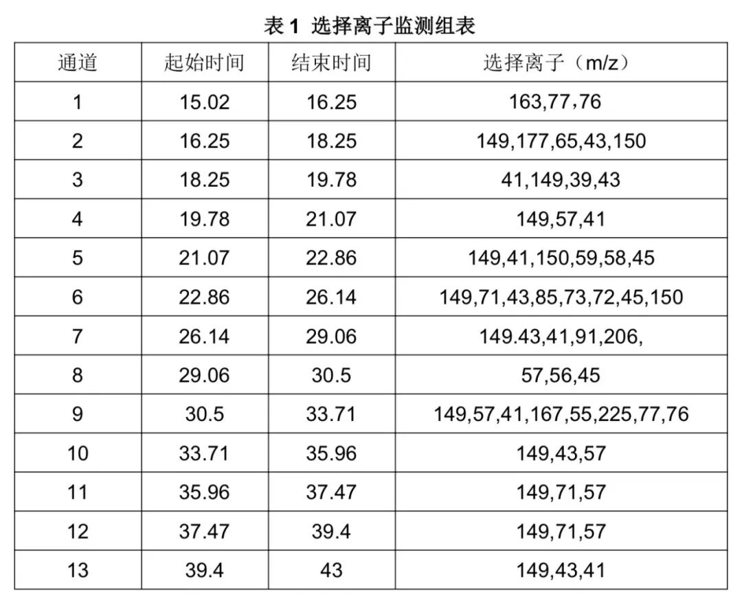 电子轰击电离源(EI):选择离子监测模式(SIM),分组监测见表1