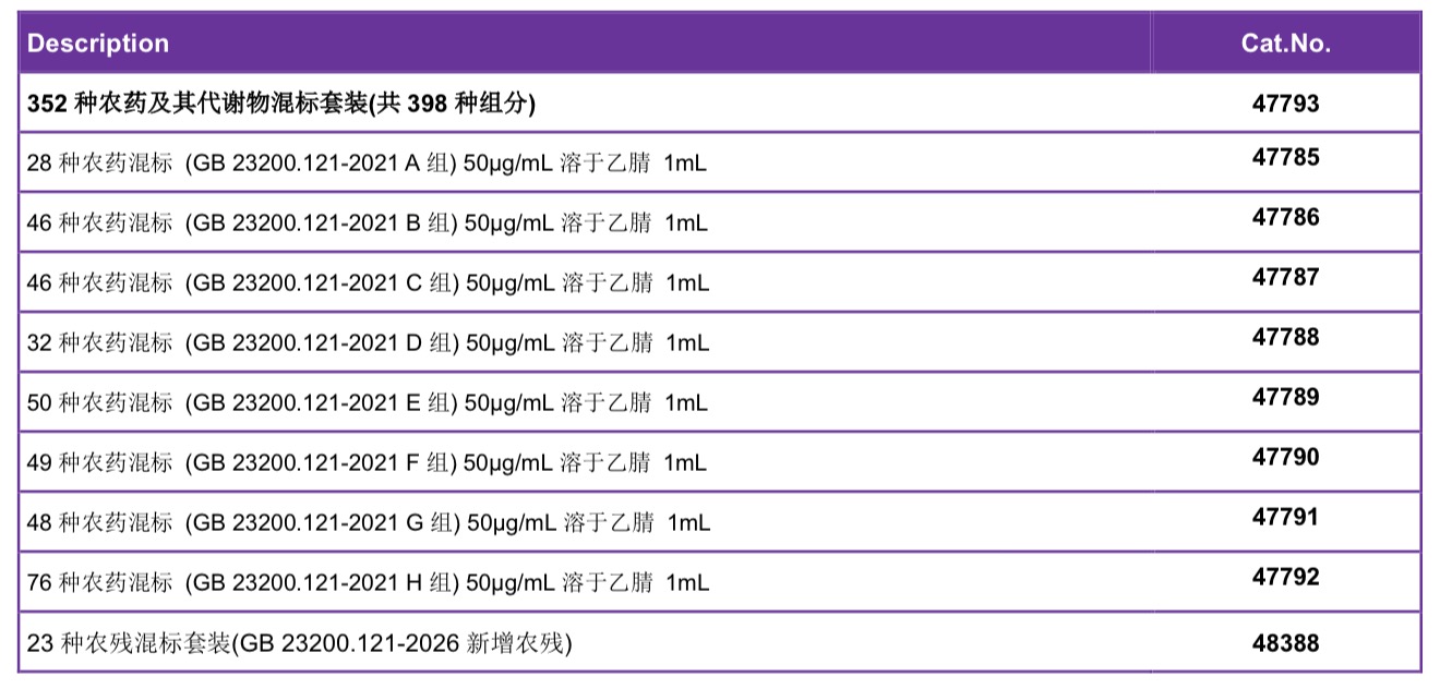 其中GB 23200.121-2026《食品安全国家标准 植物源性食品中352种农药及其代谢物残留量的测定 液相色谱-质谱联用法》替代GB 23200.121-2021《食品安全国家标准 植物源性食品中331种农药及其代谢物残留量的测定 液相色谱—质谱联用法》,主要变化如下: a) 标准名称更改;b) 增加了21种农药及其代谢物; c) 更改了试样制备的规定; d) 更改了噻氟菌胺和喔草酯的中文名称; e) 更改了啶虫脒等10种农药和代谢物的方法定量限。