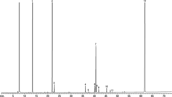 1. 丁酸乙酯;2. 莱烯;3. 桉油精;4. 香叶醇;5. 苯甲酯;6. 肉桂醛;7. 羟基香予醛;8. 百里酚;9. 肉桂醇;10. 肉桂醋酸酯;11. 香兰素;12. 水杨酸苄酯