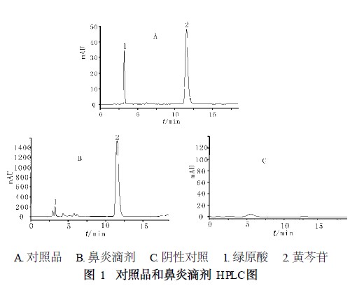 摘要:目的建立测定鼻炎滴剂中绿原酸和黄芩苷含量的方法.方法采用RP-HPLC法,色谱柱为Diamonsil C18 (250×4.6 mm, 5μm)柱,以甲醇-水-磷酸(52:48:0.1)为流动相,检测波长320nm,流速为1.0 mL/min.结果绿原酸在4.30~34.40μg/mL范围内线性关系良好,回归方程为: A = 127.3C -4.396, r = 0.9999,平均回收率102.1% ,RSD = 0.94% ;黄芩苷在15.52~108.64 g/mL范围内线性关系良好,回归方程为: A =38. 15C + 55.1, r = 0.9997,平均回收率100.8% , RSD =1.4%.结论该法灵敏,简便,准确,可用于鼻炎滴剂的质量控制.