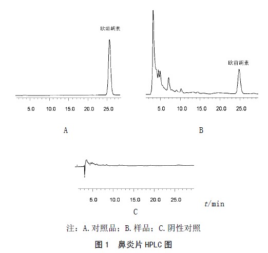 摘要:目的建立高效液相色谱法测定鼻炎片中白芷所含有效成分欧前胡素的含量.方法采用Diamonsil C18分析色谱柱(250×4.6 mm, 5μm),流动相为甲醇-水(60:40),流速为1.0 mL/min,检测波长为300 nm.结果欧前胡素在0.044~1.408μg范围内与峰面积积分值呈良好的线性关系,r=0.9999,加样回收率为98.91%,RSD=1.93%.结论本方法快速、准确,可用于鼻炎片的质量控制.