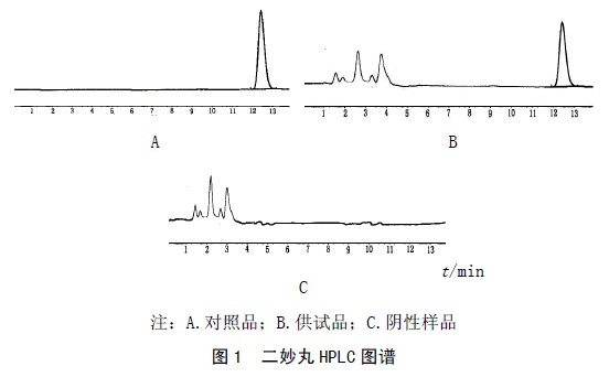 摘要:目的建立二妙丸中盐酸小檗碱的含量测定方法.方法采用高效液相色谱法,Diamonsil C18柱,以乙腈-0.1%磷酸溶液(50:50,每100mL加十二烷基磺酸钠0.1g)为流动相,流速为1.0mL/min,检测波长265nm.结果盐酸小檗碱在0.1386~2.772μg范围内呈良好线性,回归方程为Y=2572.354X+79.851,r=0.9997.平均加样回收率为98.67%,RSD=1.26%(n=6).结论方法简便、准确,专属性强,测定结果重复性好,为二妙丸中盐酸小檗碱的定量分析提供了科学有效的方法.